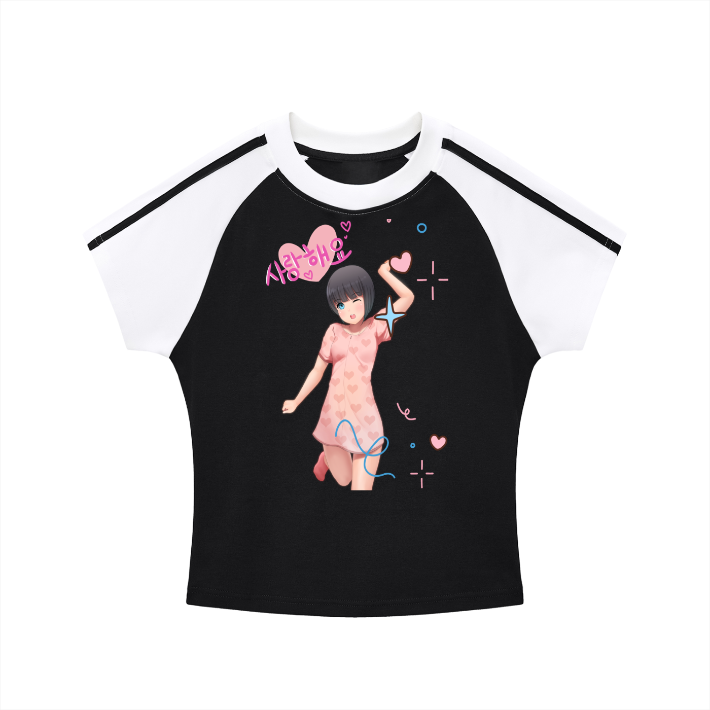 Design: A stylish black and white raglan-style "baby tee" featuring a central anime illustration of a girl in a heart-patterned dress. The graphic includes the Korean phrase "사랑해요" (I love you) in a playful pink font, surrounded by whimsical sparkles and hearts.