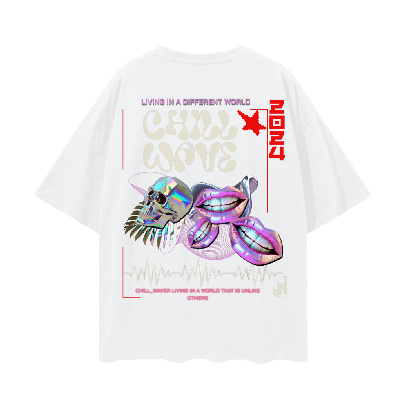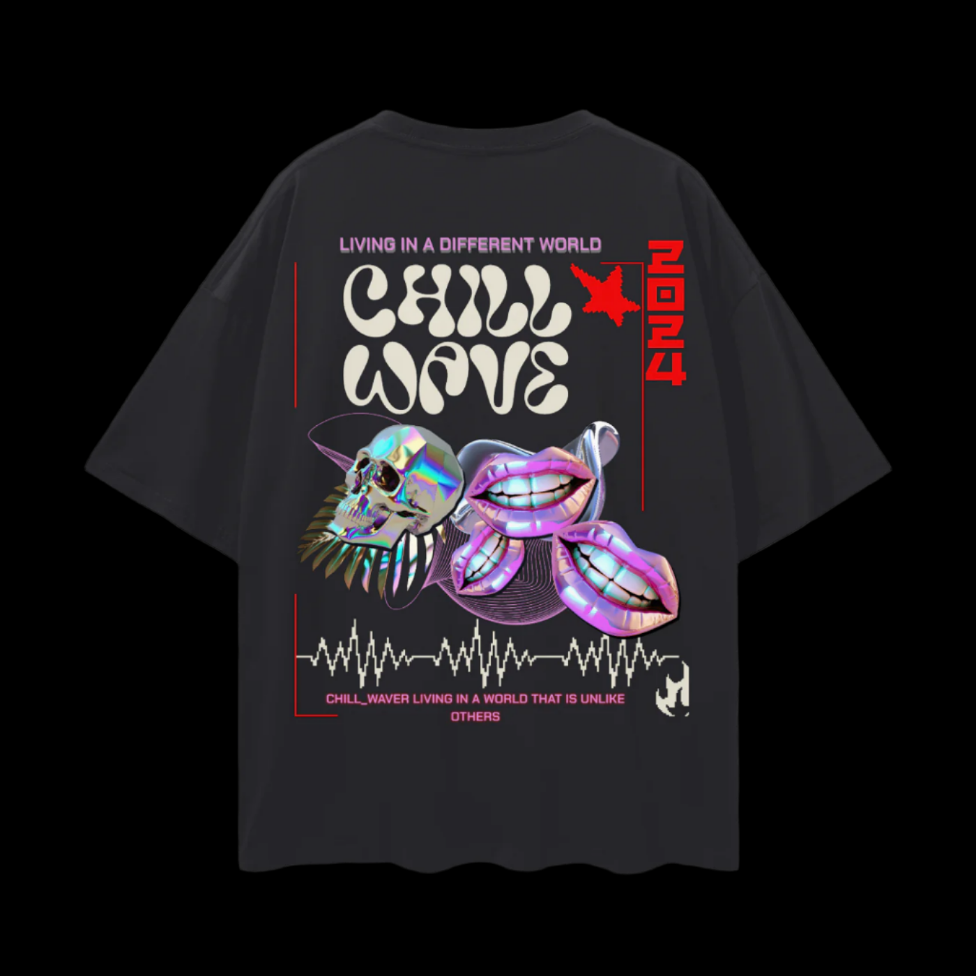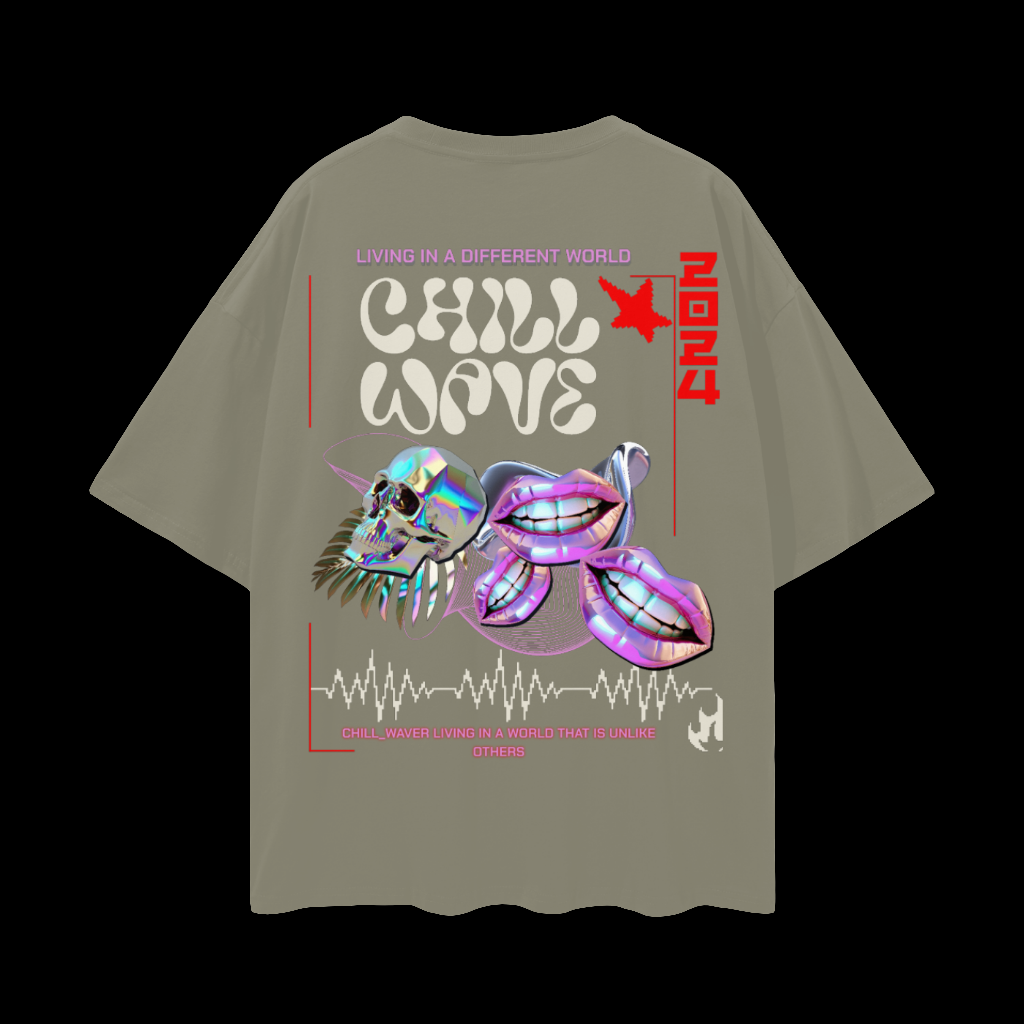 Designed to be unisex, dive into another dimension with this t-shirt's bold design. "LIVING IN A DIFFERENT WORLD," "CHILL WAVE," and "CHILL_WAVER LIVING IN A WORLD THAT IS UNLIKE OTHERS" – it's all about self-expression. Plus, there's a QR code to scan for a fun video experience that perfectly complements the aesthetic.