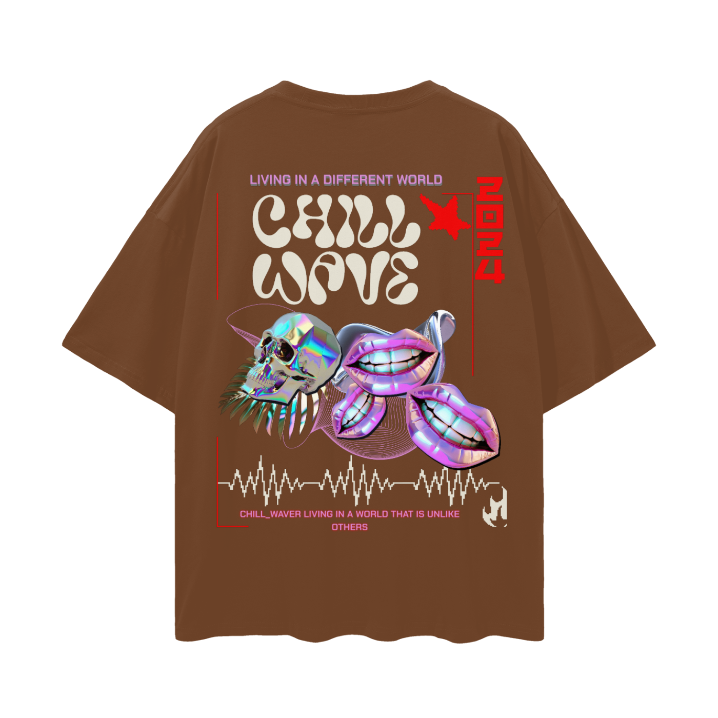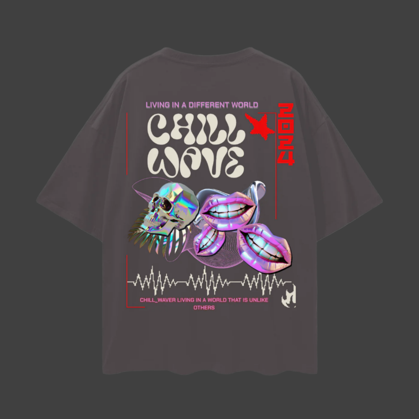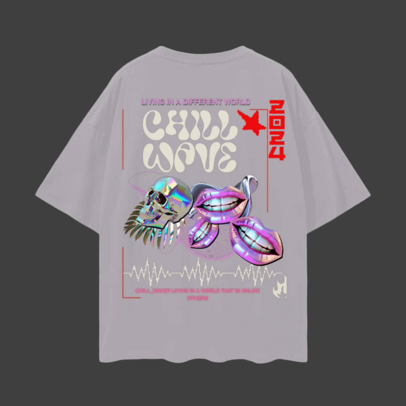 Designed to be unisex, dive into another dimension with this t-shirt's bold design. "LIVING IN A DIFFERENT WORLD," "CHILL WAVE," and "CHILL_WAVER LIVING IN A WORLD THAT IS UNLIKE OTHERS" – it's all about self-expression. Plus, there's a QR code to scan for a fun video experience that perfectly complements the aesthetic.