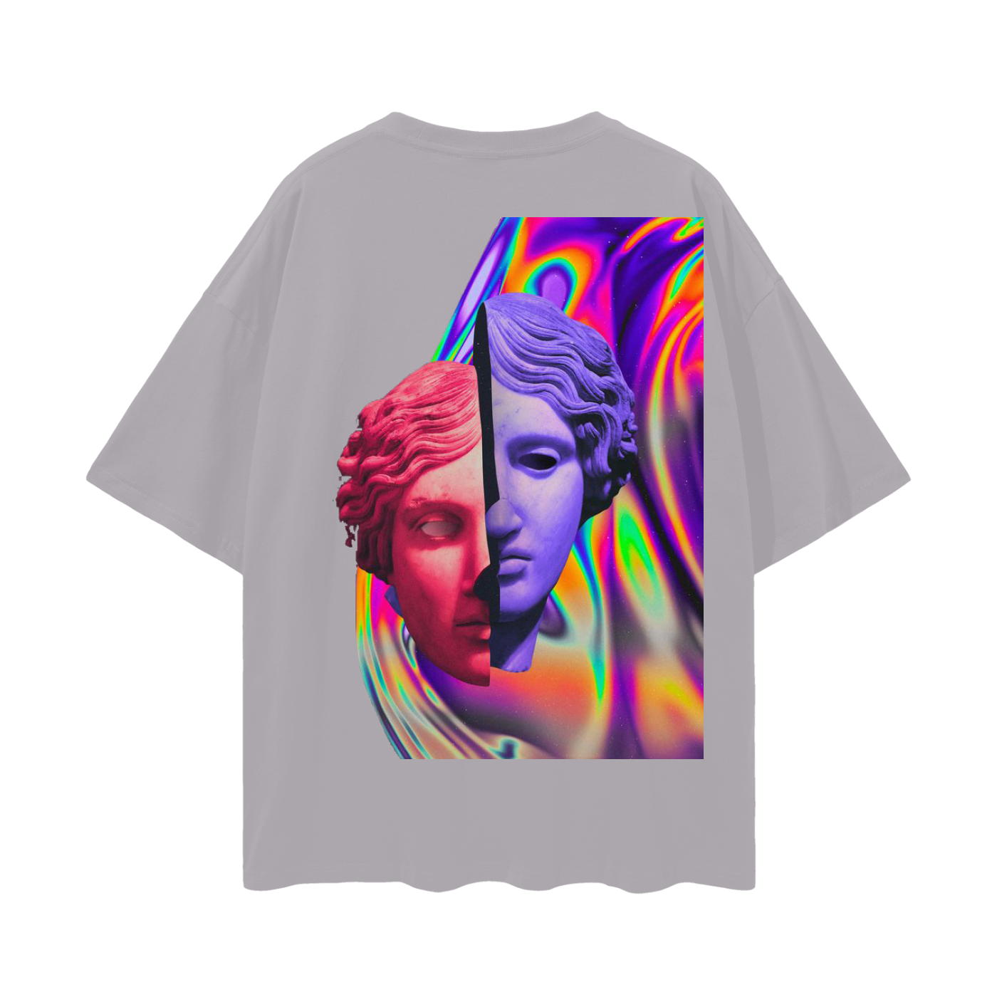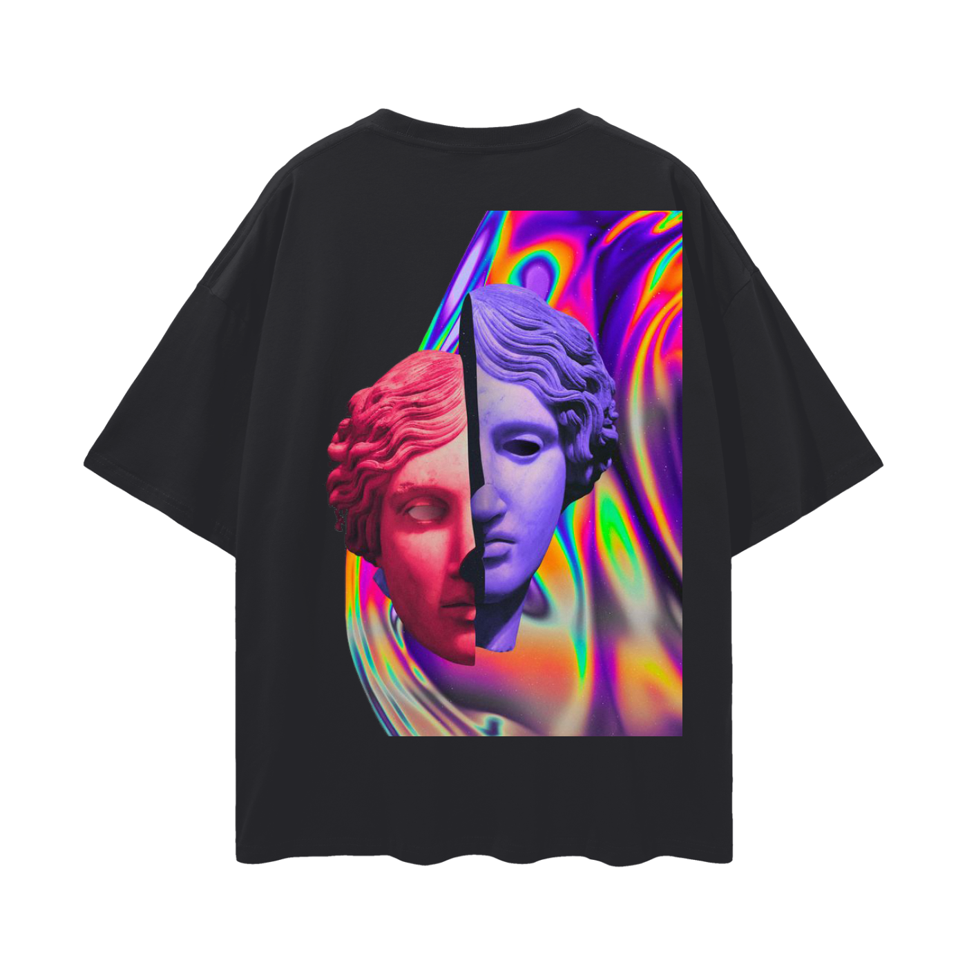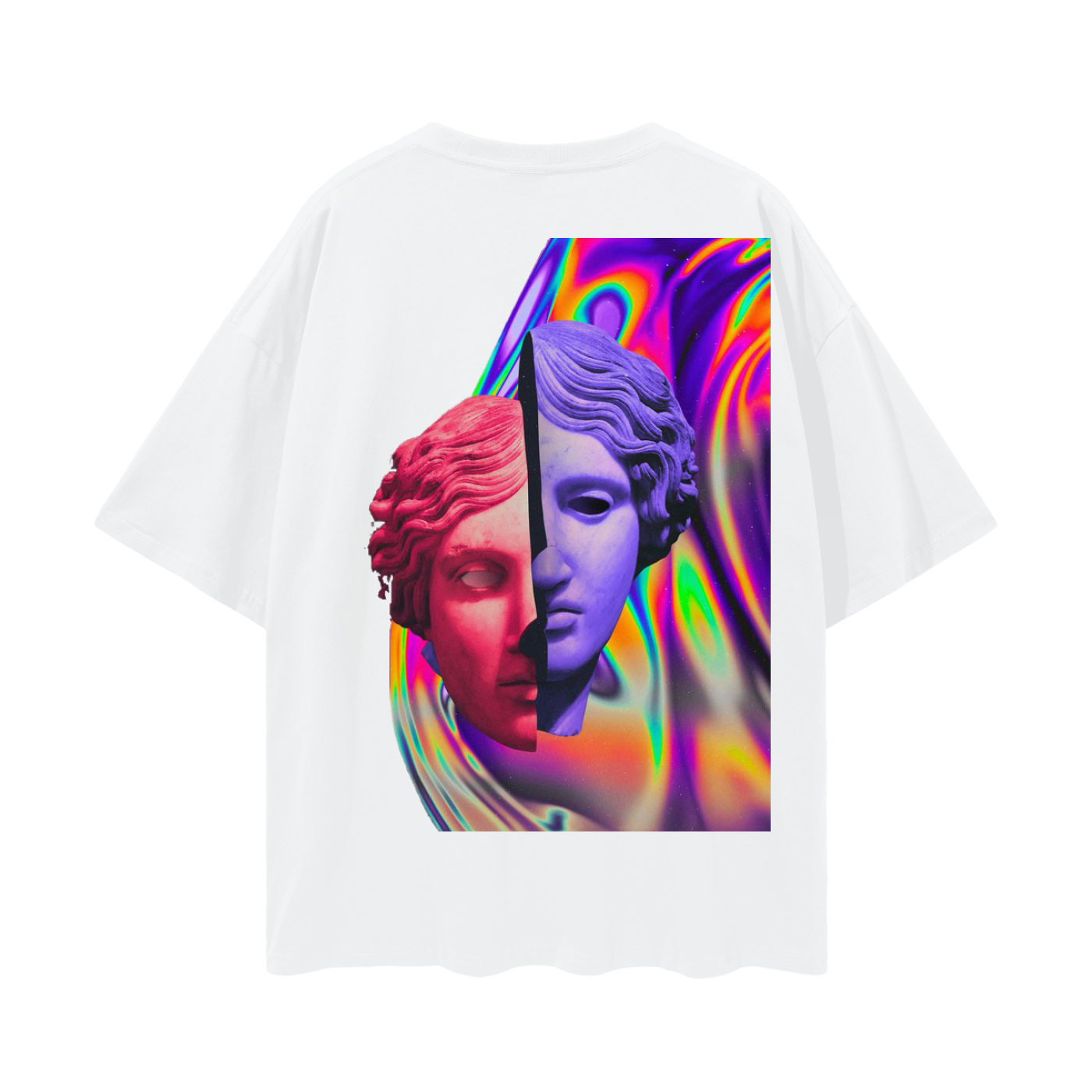 Step into a digital dreamscape where classical beauty meets the neon pulse of tomorrow. Our "Modern Mythos" tee features a mesmerizing split-image of a classical bust, half bathed in a serene, ancient glow, and half exploding with a vibrant, glitch-infused chromatic spectrum. This isn't just a shirt; it's a wearable piece of cyberpunk art, a fusion of history and hyper-futuristic aesthetics.