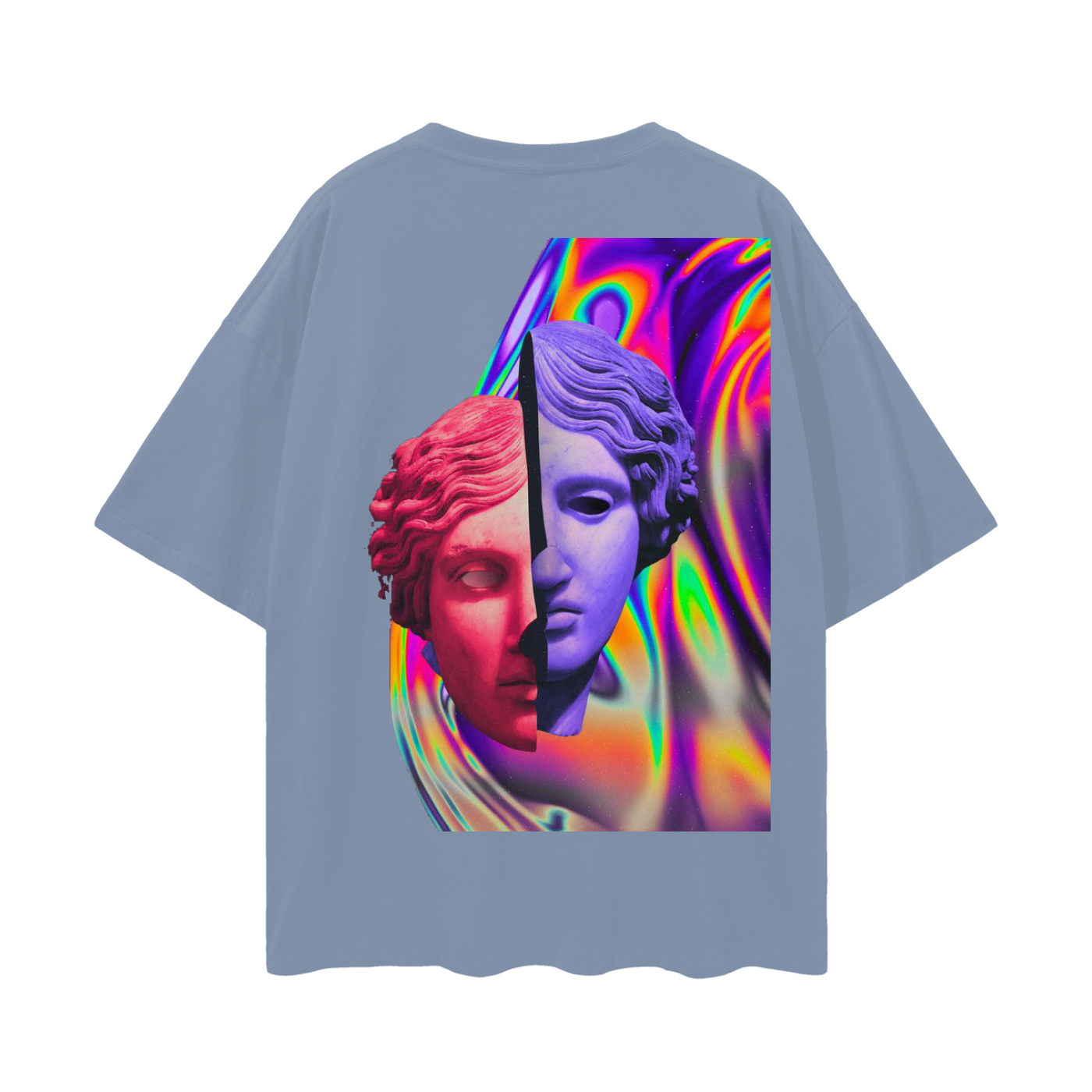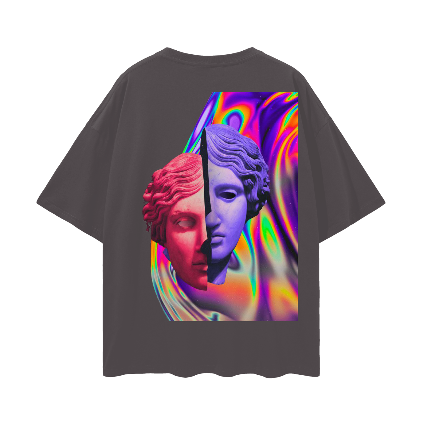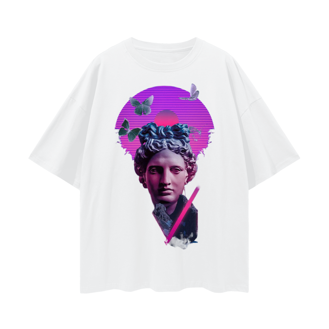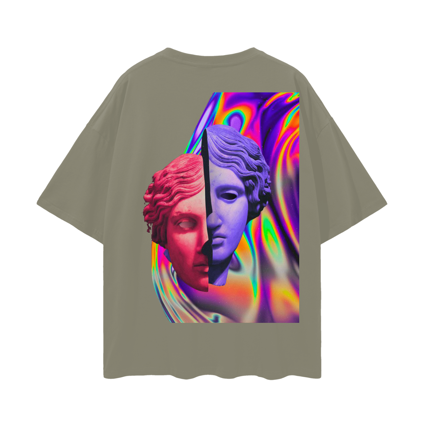 Step into a digital dreamscape where classical beauty meets the neon pulse of tomorrow. Our "Modern Mythos" tee features a mesmerizing split-image of a classical bust, half bathed in a serene, ancient glow, and half exploding with a vibrant, glitch-infused chromatic spectrum. This isn't just a shirt; it's a wearable piece of cyberpunk art, a fusion of history and hyper-futuristic aesthetics.